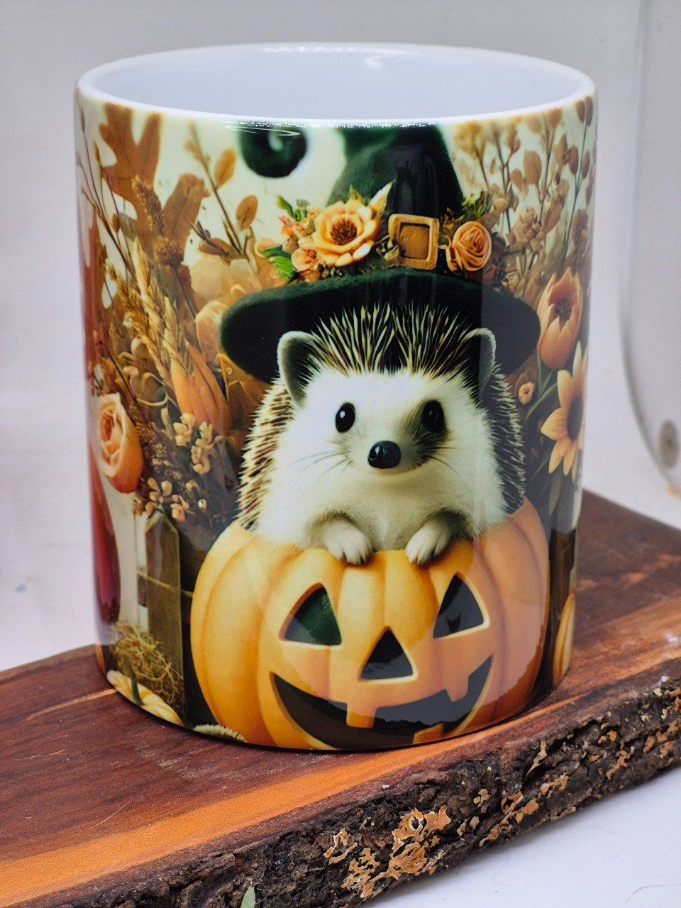 Son design unique met en scène un petit hérisson trop mignon, perché dans une citrouille sculptée, coiffé d’un chapeau de sorcière décoré de fleurs automnales.
